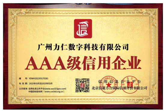近日,广州力仁数科字科技有限公司(以下简称“力仁数科”)在根据国际通行法律原则和中华人民共和国法律、行政法规规定的企业信用标准认定中顺利通过AAA信用体系认证,荣获3A级企业信用登记证书。企业信用等级是指基于评估对象的信用纪录、履约能力、经营状况、盈利能力等的指标级别,信用等级越高,代表企业的经营状况、履约行为、信用纪录越良好。此次荣获“AAA级信用企业”认证,说明广州力仁数科字科技有限公司得到了市场和专业机构的一致认可。